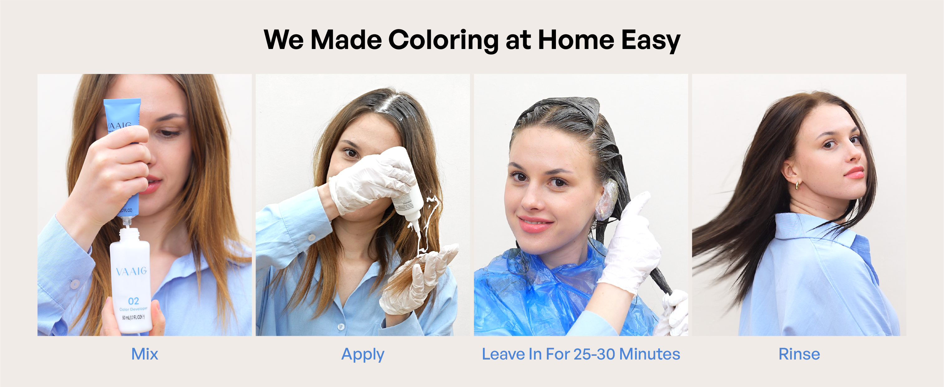 Mix → Apply evenly → Leave on for 30–40 minutes → Rinse → Condition